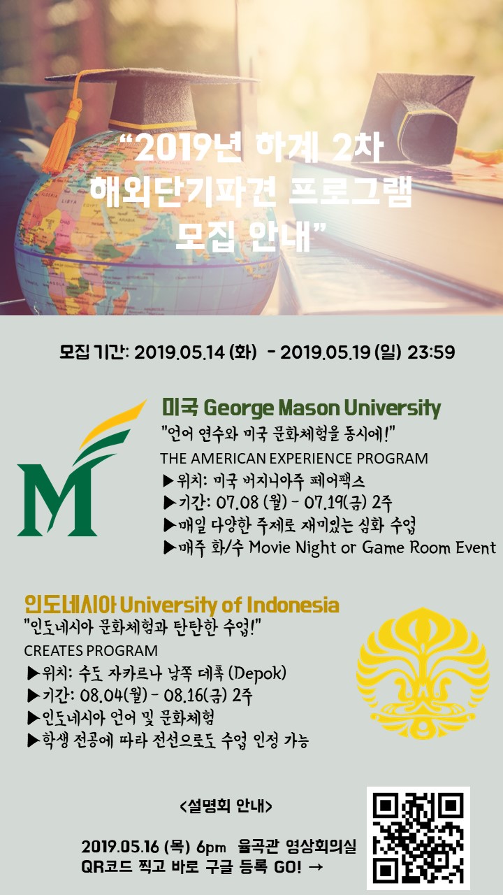 [국제교류팀] 19-하계 2차 해외단기파견프로그램 참가자 모집 안내(~5월 19일 23:59까지)