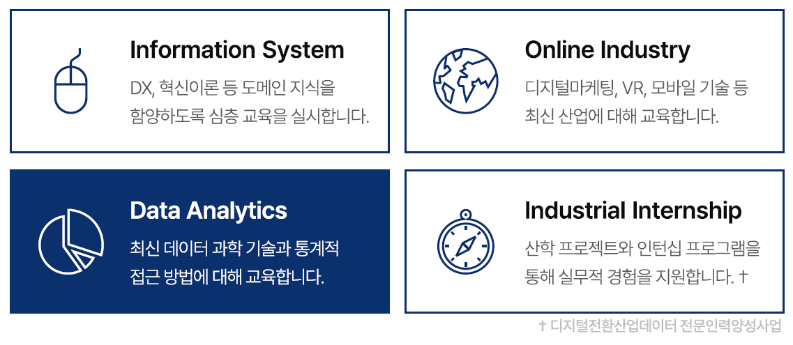 - 전문 지식의 심화: 대학원 교육은 특정 분야에 대한 심층적인 지식과 전문성을 제공합니다. 디지털 전환과 비즈니스 애널리틱스 분야에서 이는 데이터 분석, 기계 학습, 인공 지능, 빅 데이터 기술 등에 대한 고급 지식을 의미합니다. 비즈니스 애널리틱스 학과에서는 정보시스템, 데이터과학, 온라인산업 및 산업현장에 대해 심층적으로 학습합니다. DX, 혁신이론, 경영학, 소셜네트워크 등의 정보시스템 도메인 지식을 함양하고 온라인산업, 산업현장에 대한 구체적인 분야를 선정하여 분야별 전문가를 양성합니다. 또한, 데이터과학을 대표하는 통계학, 머신러닝, 텍스트마이닝 등을 학습하고 도메인지식에 기반하여 최신 A.I. 기술을 적용하는 연구 결과를 도출하도록 지원합니다.