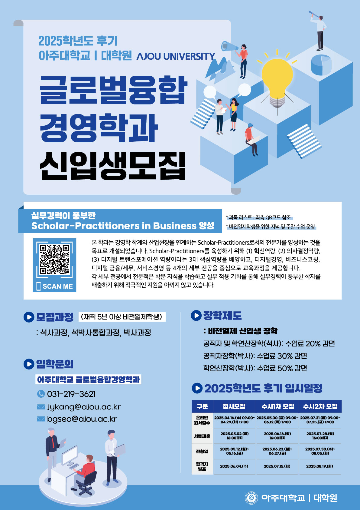 아주대학교 일반대학원 글로벌융합경영학과에서는 2025학년도 후기 신입생을 모집하오니 많은 관심과 지원 바랍니다.