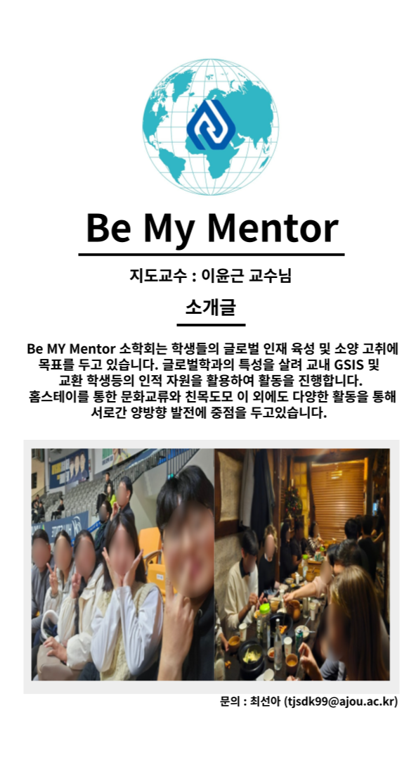 Be My Mentor 소학회는 학생들의 글로벌 인재 육성 및 소양 고취에 목표를 두고 있습니다. 글로벌학과의 특성을 살려 교내 GSIS 및 교환 학생등의 인적 자원을 활용하여 활동을 진행합니다.