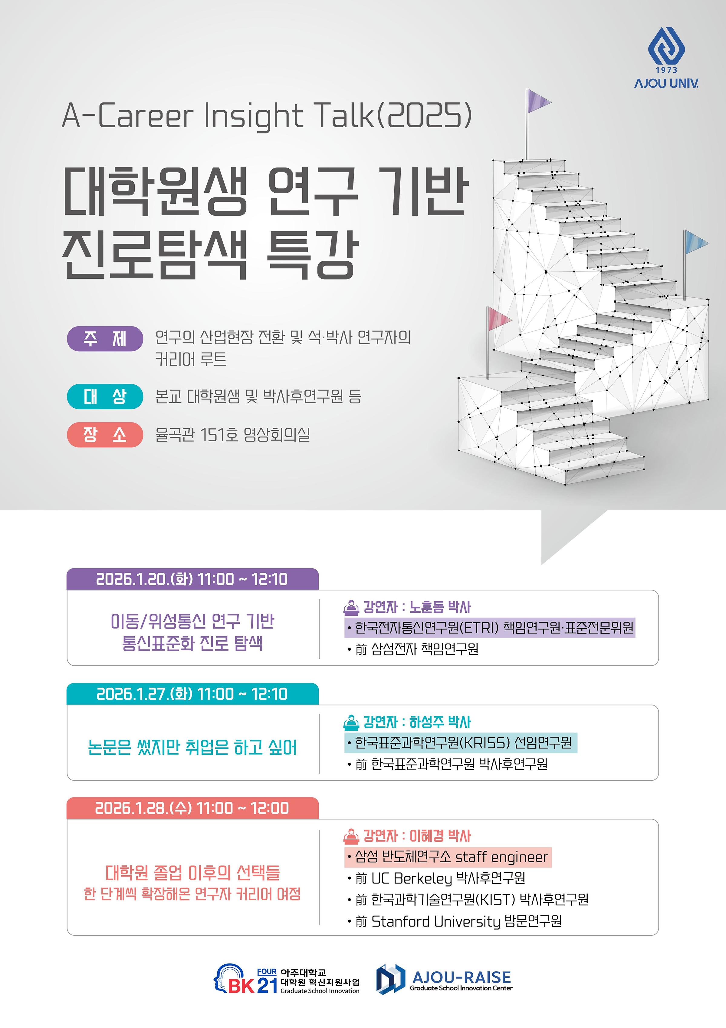 대학원생들의 진로 고민에 도움을 드리고자 아래와 같이 「A-Career Insight Talk(2025)」 대학원생 연구 기반 진로 탐색 특강을 진행합니다.