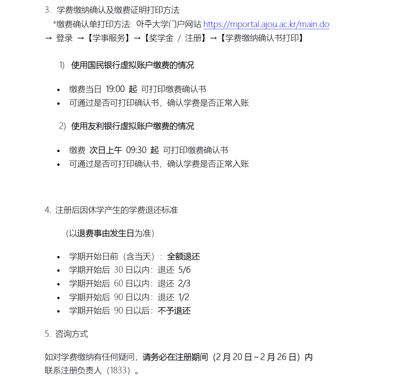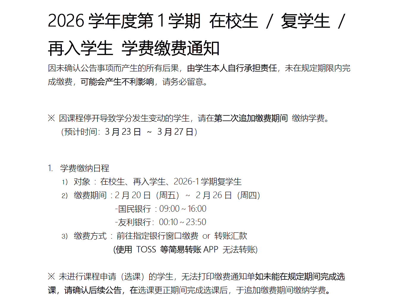 [학사] [学费缴费通知] 2026학년도 1학기 재학생/복학생/재입학생 고지서 출력 기간 및 등록금 납부 관련 안내