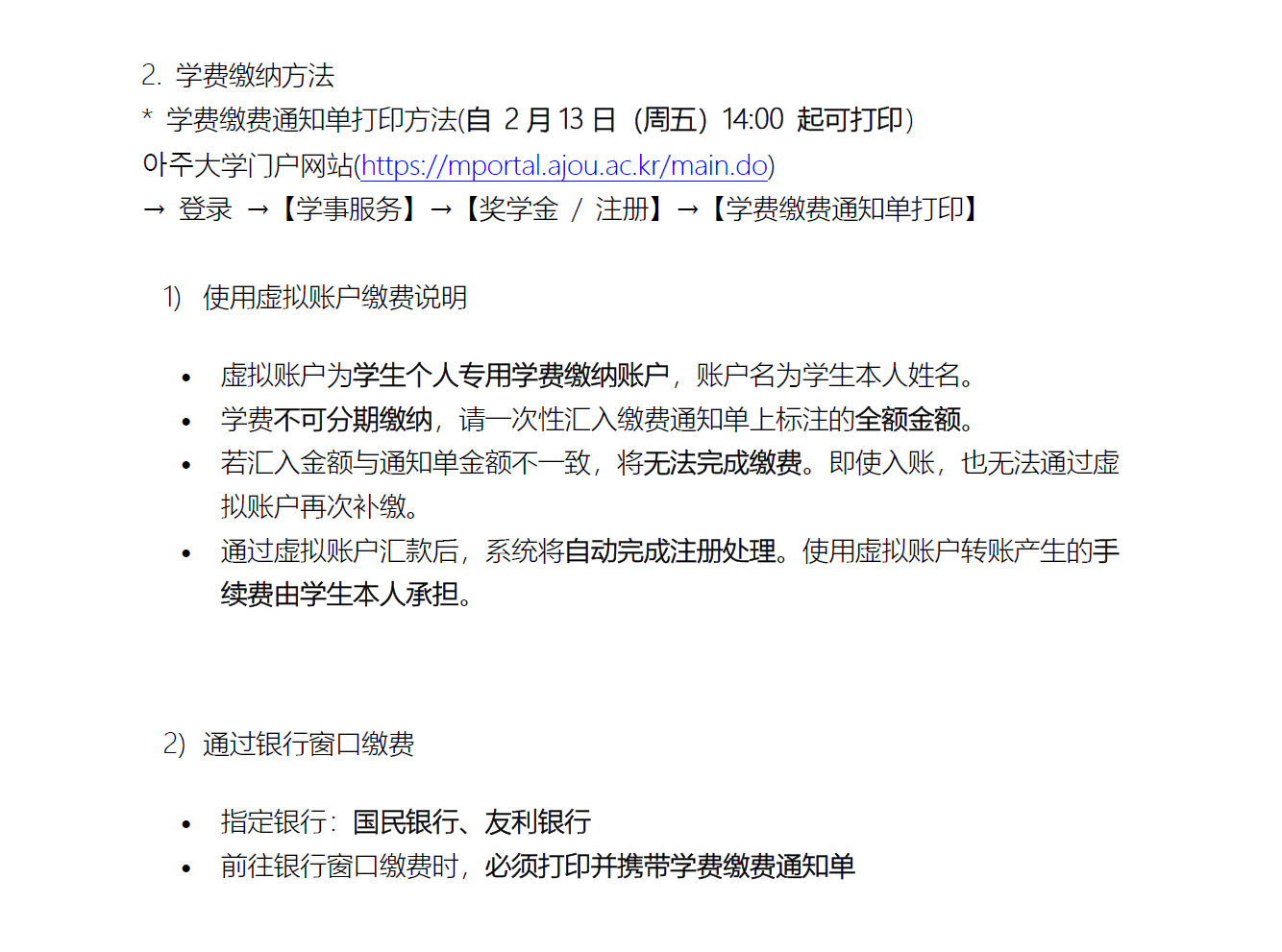 - 은행창구에서 등록금을 수납할 경우 등록금 고지서를 반드시 출력하여 지참해야 함