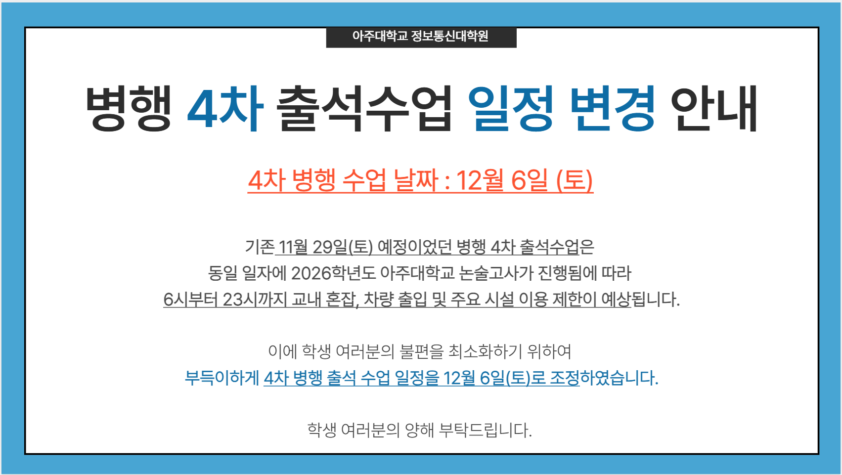병행 출석수업 일정 변경 안내