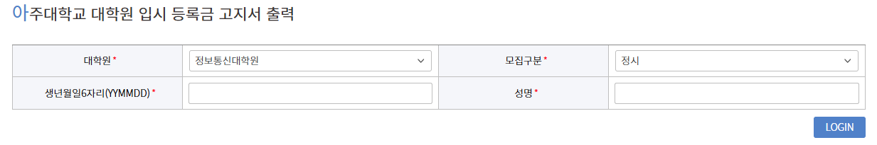 ※ 대학원-정보통신대학원, 모집구분-정시 선택 후 생년월일 6자리와 성명 입력 후 LOGIN 버튼 클릭