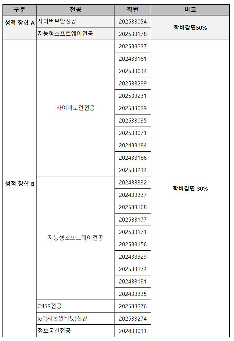 2025학년도 2학기 성적우수 장학생을 아래와 같이 공지합니다.